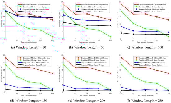 For the same device, if the window length is set to 150, in order to achieve 2 m localization error, the data amount needed for RCILS is 15 min, while that for the traditional method is 150 min. RCILS needs smaller amounts of data for crowdsourcing-based localization. This demonstrates that RCILS is more applicable than the traditional crowdosurcing-based system using a point-based radio map model.