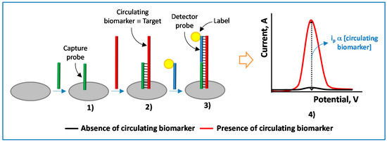 Electrochemical genosensing seeks to exploit the great potentiality of coupling specific and efficient affinity reactions involving nucleic acids with electroanalytical techniques. This combination typically allows the development of inexpensive and rapid methods to determine analytes in a highly sensitive and selective manner, in a broad context facing a wide variety of analytical problems in biomedical research, drug discovery, environment, food, process industries, security and defense and particularly relevant nowadays in clinical diagnosis. Although electrochemical nucleic acid-based sensors exploit a range of distinct chemistries, they all take advantage of the nanoscale interactions (mainly hybridizations, ligations or conformational changes) between the target present in solution, the recognition layer, and the electrode surface, allowing their electrochemical detection using inexpensive analyzers [2]. As a general example, Figure 1 shows a schematic display of the main steps involved in an electrochemical DNA sensor for the detection of a particular target using a sandwich hybridization format and electrochemical detection (by differential pulse voltammetry) of the redox label with which the detector probe has been conjugated. Moreover, the growing research in advanced nanomaterials has impressively impacted also this field, by providing a large variety of novel, versatile and rationally designed nanostructured supports for transduction, signal generation and amplification purposes [3]. Indeed, the specific and efficient interactions involved in electrochemical genosensing can be detected by using various electrochemical strategies that exploit the redox reactions of reporters or enzymes, direct or catalytic oxidation of nucleic acid bases and electrochemistry of nanoparticles, conducting polymers (CPs) and quantum dots. In parallel with the major advances in nanotechnology, the wide variety of commercially available nucleic acids conjugated on demand with a variety of tags depending on the required needs, the versatility of design and modification offered by electrochemical substrates and the excellent performance and variability of powerful electrochemical techniques have also played major roles in the outstanding capabilities demonstrated by electrochemical biosensors. The aim of this review article is to shed useful insights into the latest advances, current trends and challenges and future prospects in the exciting field of electrochemical genosensing focused on the determination of circulating biomarkers.