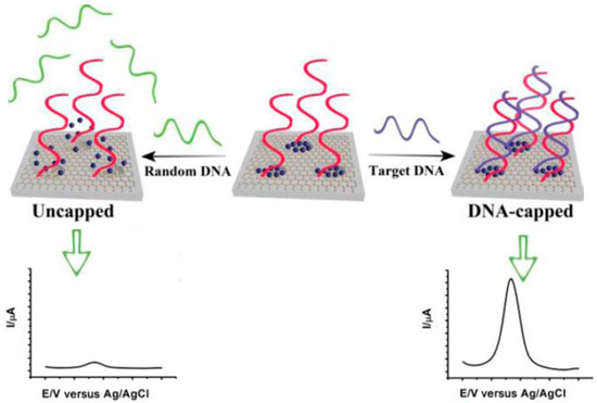 Schematic display of the target-responsive encapsulation nucleic acid-based electrochemical biosensor functioning and the DPV signals obtained in the presence and in the absence of the target DNA. Reprinted and adapted from [48] with permission.