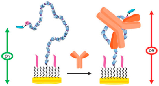 Interesting methods involving the use of specific DNA and peptide sequences have been reported recently for electrochemical genosensing of viruses and autoantibodies specific to them. An electrochemical peptide-based sensor for HIV antibodies detection was developed by McQuistan et al. [50] by self-assembling a specific thiolated peptide labeled with MB as electrochemical indicator, and short thiolated DNAs as anti-fouling diluents on gold electrodes (Figure 3). The recognition between the peptide probe and the antibody damped the probe flexibility and this limited surface mobility was followed by the decrease in the MB reduction peak obtained by alternating current voltammetry (ACV). Results reported by the authors demonstrated the major role of the short DNA diluents used to prevent surface fouling, a LOD of 1 nM and promising applicability to perform the determination of HIV antibodies in spiked 10% saliva samples.