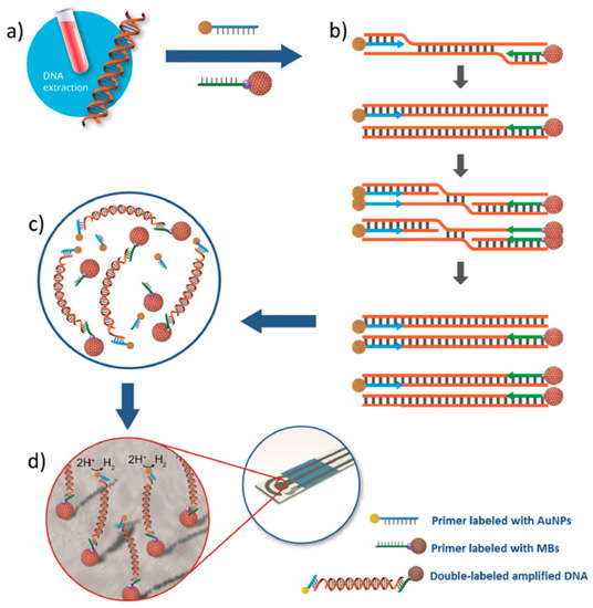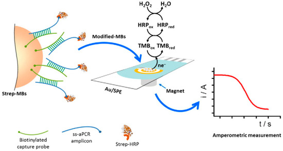A disposable amperometric MBs-based DNA sensor coupled to asymmetric PCR (aPCR) was developed for the detection of Streptococcus pneumoniae (S. pneumoniae) [54]. This method relied on the selective hybridization of specific biotinylated capture DNA probe, complementary to a specific region of the pneumococcal lytA gene. The biotinylated synthetic target or the predominantly 235-base single-stranded (ss) amplicon generated by direct asymmetric PCR (daPCR) from bacterial cultures were hybridized onto Strep-MBs modified with a specific biotinylated DNA probe. After labeling of the biotinylated duplex formed at the Strep-MBs with Strep-HRP, amperometric detection was performed upon addition of H2O2 at tetrathiafulvalene (TTF)-Au-SPEs (Figure 4). LOD values of 5.1 and 1.1 nM for the 20-mer synthetic target DNA and the ss-aPCR amplicon were achieved, respectively. Moreover, daPCR amplicons could be obtained with as few as 2 CFUs of S. pneumoniae. Furthermore, this methodology demonstrated a clear discrimination against Streptococcus mitis (a closely related streptococcus) and between blood and urine samples non-inoculated and inoculated with the target bacteria at a very low concentration (103 CFUs mL−1). The DNA sensor was successfully validated with 109 clinical samples of diverse origins providing both sensitivity and specificity of around 90% [55].