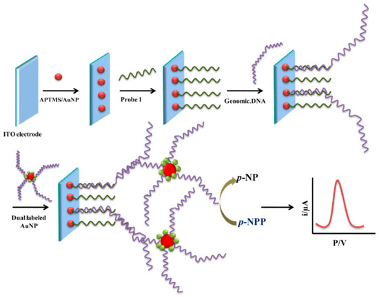 Thiruppathiraja et al. [58] developed a sandwich-based DNA biosensor for Mycobacterium sp. genomic DNA detection using dual labeled-AuNPs for amplification purposes. The target DNA is sandwiched between a specific probe immobilized on a ITO electrode modified with a (3-aminopropyl)trimethoxysilane (APTMS) SAM and the detector probes immobilized together with the enzyme alkaline phosphatase (AP) on AuNPs (Figure 5). The electrochemical detection was performed by DPV using p-nitrophenol phosphate as enzyme substrate. The method allowed a LOD of 1.25 ng mL−1 genomic DNA and was successfully evaluated in clinical sputum samples.