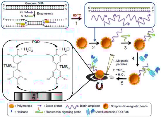 Lobo-Castañón´s group developed also an attractive electrochemical genomagnetic approach by combining the use of MBs and chronoamperometric detection at SPCEs with asymmetric helicase-dependent DNA amplification (HDA) to amplify an 84-base-long ss-DNA fragment from the insertion sequence IS6110 characteristics of M. tuberculosis [62]. The method involved the immobilization of the biotinylated ss-amplicon onto the surface of Strep-MBs, the hybridization of the captured amplicon with an FITC-detector probe and subsequent labeling with an HRP-conjugated antiFITC antibody (Figure 6). The electrochemical transduction was performed upon capturing magnetically the modified MBs onto the SPCE surface by chronoamperometry and the H2O2/TMB system. The method allowed obtaining a linear range from 1 aM to 1 fM and LOD of 0.5 aM for the synthetic target DNA determination in less than 4 h. A year later, same group [63] compared the performance of this method with that achieved by using asymmetric PCR. The same dynamic range (between 30 and 3000 copies) were obtained with both amplification strategies and similar LODs of 11 and 15 copies (0.4 and 0.5 aM) using PCR and HAD, respectively, were found. The electrochemical genosensor coupled with both amplification approaches demonstrated comparable and successful results in the detection of M. tuberculosis in clinical samples (sputum, urine, and pleural fluid samples).