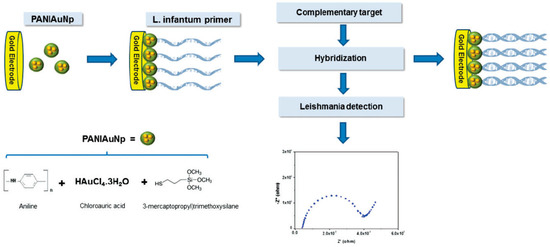 García et al. developed an electrochemical DNA sensor for specific detection of Leishmania infantum (L. infantum) genome [65]. This biosensor involved the immobilization of a DNA probe onto a gold electrode previously coated with a layer of 3-mercaptopropyltrimethoxysilane on polyaniline matrix containing AuNPs (PANIAuNPs) (Figure 7). By evaluating the primer-genome interaction by EIS using Fe(CN)63−/4−, the developed sensor recognized the L. infantum genomic DNA at different concentrations (1–4 ng mL−1) and demonstrated applicability to the analysis of contaminated canine serum samples.
