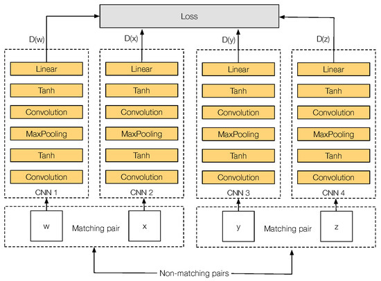 where corresponds to the distance between the descriptors of the matching pair w and x, ; corresponds to the distance between the descriptors of the matching pair y and z, ; corresponds to the distance between the descriptors of the non-matching pair w and y, ; corresponds to the distance between the descriptors of the non-matching pair x and y, ; corresponds to the distance between the descriptors of the non-matching pair w and z, ; and corresponds to the distance between the descriptors of the non-matching pair x and z, .