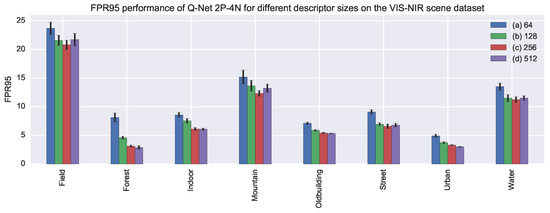 FPR95 performance on the VIS-NIR scene dataset for Q-Net 2P-4N using different descriptor sizes ((a) 64; (b) 128; (c) 256 and (d) 512). Shorter bars indicate better performances. On top of the bars, standard deviation values are represented with segments.