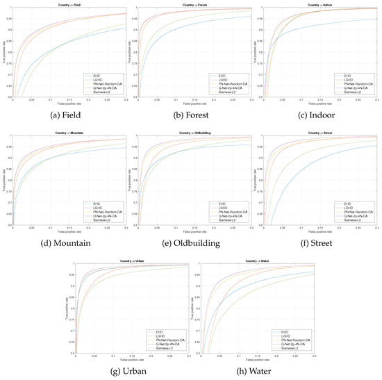 ROC curves for the different descriptors evaluated on the VIS-NIR dataset. For Q-Net and PN-Net, we selected the network with the best performance. Each subfigure shows the result in one of eight tested categories of the dataset.