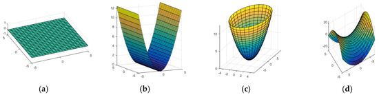 Quadratic surfaces from: (a) Plane (); (b) Parabola (); (c) Elliptic paraboloid (); and (d) Hyperbolic paraboloid ().
