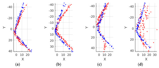 Comparison of different shapes with shape distances. The blue dots represent the reference shape which is the same in the four figures while the red dots represent the different compared shapes. The corresponding shape distances are denoted by below the figures. (a) ; (b) ; (c) ; (d) .
