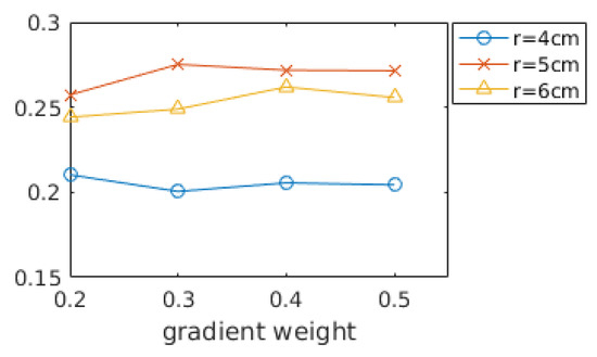 In Section 3.3, the gradient weight was optimized by Equation (13) under the assumption that a distance between shape descriptors should be proportional to the corresponding shape distance. To see the validity of the assumption, shape recognition rates are evaluated while varying gradient weights as shown in Figure 4. The shape recognition rate (Precision-1) is defined in Section 4.4 in detail. The shape recognition rates are averaged over all the datasets in Table 2. The performance did not vary much with gradient weight but does with a support radius. As we expected in Section 3.3, the best result is obtained when the gradient weight is 0.3 and the radius is 5 cm. In addition, we can observe that the best radius is 5 cm and the smaller radius (4 cm) is less dependent on the gradient terms than the best radius.