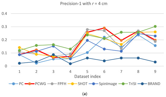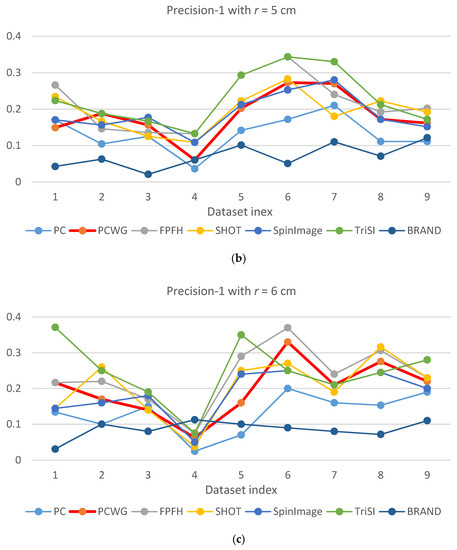Precision-1 comparison of seven descriptors over nine datasets with different support radii: (a) r = 4 cm, (b) r = 5 cm, and (c) r = 6 cm.