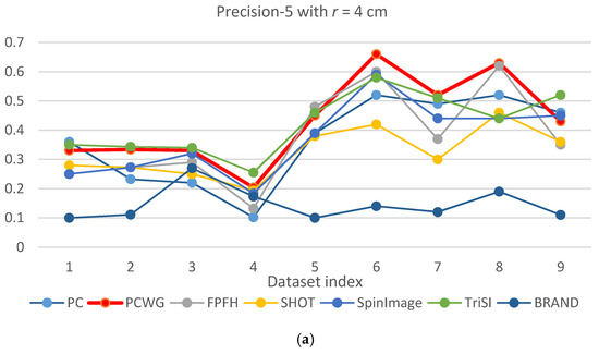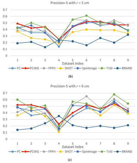 Precision-5 comparison of seven descriptors over nine datasets with different support radii: (a) r = 4 cm, (b) r = 5 cm, and (c) r = 6 cm.