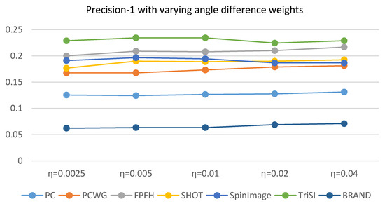 The effect of the angular difference weight, , in Equation (12) is addressed here. This parameter balances the point-to-plane distance and the angular difference. Since the shape distance was used to find ground truth correspondences for shape recognition, the parameter should be carefully selected but it is more desirable that the shape recognition rate is insensitive to the parameter. We evaluated Precision-1 with different values of the parameter. For simplicity, a single support radius, 5 cm, was used and the precisions over the nine datasets were averaged. The results were shown in Figure 7. While the angular difference weight varied from 0.0025 to 0.04, the precisions differed just 1 or 2 percentages. As the shape recognition rate is not sensitive to the angular difference weight, our shape distance metric with can be considered to be generally reliable to find ground truth correspondences and not biased to any descriptor.