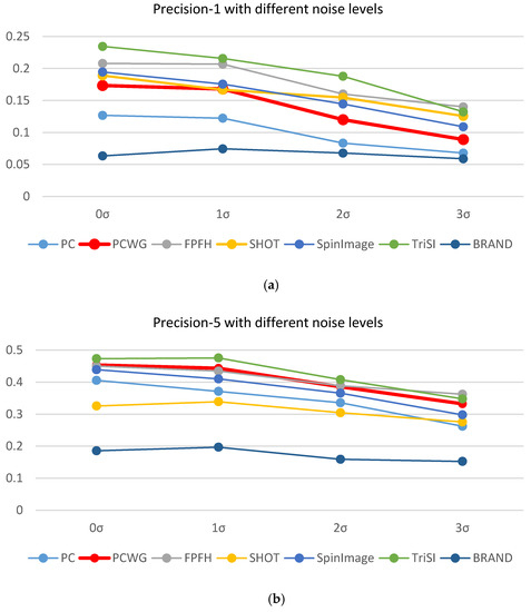 Precisions of seven descriptors with different noise levels. The horizontal axis represents the standard deviation of additive noise to raw depth images. 0 σ means that raw depth images were used. (a) Precision-1 and (b) Precision-5.