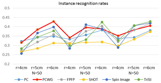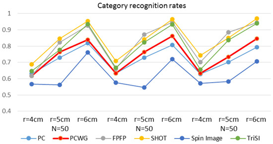 Figure 9 and Figure 10 show the instance and category recognition results, respectively. Generally, PCWG ranked high in instance recognition but low in category recognition, and surprisingly, the simplest PC also showed the meaningful performance in instance recognition. On the contrary, SHOT showed the best performance in the category recognition but the worst in instance recognition. It seems that PCWG was better in matching specific shapes, while SHOT was better in the generalization of shapes. Spin Image showed generally low performance in category recognition. It is noteworthy that the both performances tend to increase with the radius in most of the descriptors. It is more apparent in the category recognition.