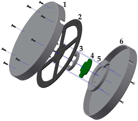 Because the sensor must sometimes undergo very high strain as in the case of spastic episodes, its construction needs to meet stability criteria. The strain gauge disc—SGD’s maximum load capacity is 1400 N. This load limit can be increased by using a more sturdy housing (see Figure 3, Part 1 and Part 6), if needed. Despite the high load-bearing capacity, the sensor must be capable of processing a user’s fine-motor movements since users with spastic disorders have a similar range of strength and motion as healthy people. It is very important that users do not trigger unintended actions during spastic fits. A flat disc (120 mm in diameter) seemed to make the most sense due to the aforementioned reasons. The actual sensor (see Figure 3) is made of a carbon fiber reinforced composite (CFRP) carrier (Figure 3, Part 2) that is attached to four strain gauges. A circuit board is positioned underneath the carrier (Figure 3, Part 4) with four differential amplifiers AD 623 [17] and an analog-to-digital converter (ADC) AD 7811 [18] with an integrated SPI (Serial Peripheral Interface) data output. The user can incline the disc in any direction by shifting its weight (x-, y-axis) on the upper cover (Figure 3, Part 1). As a result of the design, the edge of the CFRP carrier is pressed downwards during x- and y-axis movements, while the opposite side of the CFRP carrier lifts up. Due to this fact, a plausibility test can be carried out since a defined measured value of the opposite strain gauge must be present for each measured value. This software process is described in detail in Section 3.2. The upper housing (Figure 3, Part 1) can also be pressed down. In doing so, all four strain gauges are deflected in one direction (z-axis), which makes other control options possible, such as operating a computer mouse (mouse click). The sensor’s parts labeled Part 3 and Part 5 (Figure 3) only serve as spacers. The entire sensor can also be integrated into a control panel in front of the user, such as in an electric powered wheelchair. In this case, for example, the entire control panel could be made of CFRP. The interlocking parts of the housing (see Figure 3, Part 1 and Part 6) protect the CFRP carrier against damage.