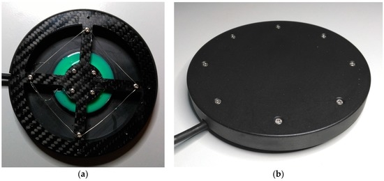 The prototype’s CFRP carrier (Figure 4) is made of a CFRP plate measuring 1.3 mm in diameter. The material thickness can be adjusted depending on the application as CFRP has excellent durability compared to other materials. Compared to aramid fiber reinforced composite (AFRP) and glass fiber reinforced composite (GFRP), CFRP has superb dynamic properties [19]. The CFRP’s reset behavior is of particular importance. When the sensor is overstrained, the interlocking parts of the casing (see Figure 3, Part 1 and Part 6) protect the CFRP carrier against damage. Thanks to the housing’s design, the maximum stroke of the sensor can be mechanically limited. If the load is too high (max. 1400 N) or the stroke is too forceful, the incoming forces are distributed past the CFRP carrier via the housing. The CFRP compensated strain gauges are glued and soldered to the circuit board. Additional cross linking silicon can then be poured over the circuit board and the strain gauges. This makes the sensor usable in humid environments. For testing purposes, the CFRP carrier was also subjected to stretching. The design shown in Figure 5, which has a CFRP material thickness of 1.3 mm, broke under a tensile load of 102 N. It is not possible, however, to pull the sensor’s housing without any aids. The 1.3 mm material thickness is a very good compromise between responsiveness and durability.