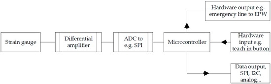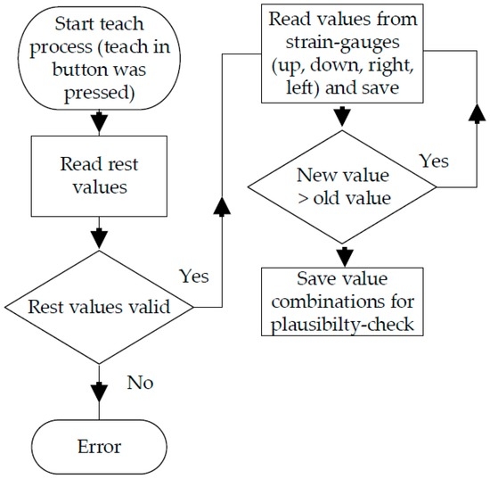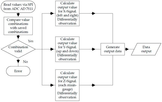 During normal use (see Figure 11), the ADC’s data are read via SPI. Afterward, a plausibility check is performed. In doing so, the values of two strain gauges opposite each other are combined. Theses pairs of values have to match the value pairs stored during the calibration process. This way, a very large portion of all the possible errors can be identified. If there is an error, the microcontroller sends neutral values to the systems that are connected to it and a separate error notification is sent via I/O pin.