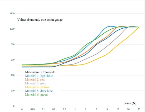 Depending on the version, the restoring force is caused by the CFRP on its own or additionally via silicone rubber. Table 1 and Figure 7 show the measured values of one SG in relation to the applied force. Various silicone rubber mixtures and different material thicknesses (see Table 2) are shown by way of example. Due to the fact that the measurement curves are identical in each direction, the measurement was carried out only for one SG. Depending on the CFRP motion carrier and the polymers shore hardness, the maximum value of the 10-bit ADC (1024) is achieved at different degrees of force. Additional forces impact the housing beyond the maximum value of 1024 (see Figure 3, Part 1 and Part 6).