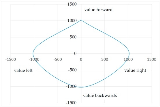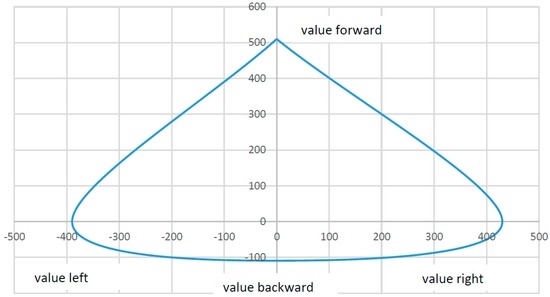 If the values in Figure 8 were sent directly to an EPW, the user would only be able to drive forward, right, and to the left at an acceptable speed. The maximum values for backwards are insufficient to move the wheelchair. The correct multiplication factors can help attain a consistent output signal.