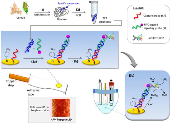 A schematic representation of the proposed method for controlling the presence/absence of genetically modified organisms in food and feed is depicted in Figure 1. After DNA extraction, specific PCR amplification of Cauliflower Mosaic Virus 35S promoter (GenBank accession number AY326434) was performed. Then, enzyme-amplified electrochemical detection of the amplicons was carried out. The chronoamperometric detection of the specific DNA fragment of P35S was based on a sandwich hybridization assay previously optimized by our group. In short, the genosensor was prepared on a gold thin-film previously washed with ethanol and water, and dried under a stream of nitrogen gas. After conditioning, a binary self-assembled monolayer composed of a thiolated capture probe (CP) and p-aminothiophenol (p-ATP) was built following a backfilling strategy described elsewhere [14]. This thioaromatic agent leads to lower background signals in comparison to the typically used 6-mercaptohexanol, and improvement in sensing surface stability [16]. Hybridization experiments were performed in a sandwich-like format to maximize the selectivity of the assay, see Materials and Methods.