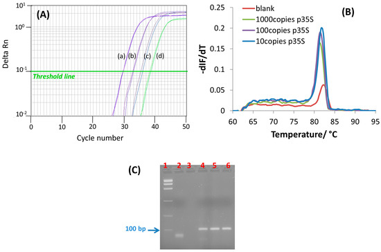 (A) Amplification curves obtained for real-time fluorescence-based PCR of genomic DNA extracted from MON810 maize flour. The initial number of P35S copies per assay was (a) 103, (b) 102, (c) 10, (d) non-template control. The horizontal green line indicates the threshold level used to establish the calibration curve; (B) Fluorescence-based melt curves recorded after the real-time PCR amplification experiments presented in (A); (C) 3% Agarose gel electrophoresis (in 1× TBE buffer) of PCR products from different initial number of P35S copies per assay (lane 1, ladder; lane 2, non-template control, lane 4, 10 copies, lane 5, 102 copies; lane 6, 103 copies).