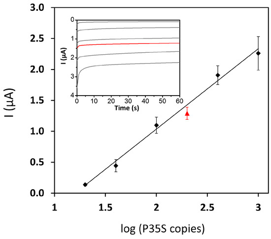 Figure 3 shows the cathodic currents recorded chronoamperometrically as a function of the initial P35S copies in MON810 GM-maize. A linear calibration [I (µA) = −1.3 (±0.1) log10 (P35S copies) + 1.6 (±0.2); r = 0.997] was accomplished from 20 to 1000 copies, that is, from 0.2% to 10% of MON810 GM maize. It is important to point out that 0% MON810 certified reference material gave a similar response to that from the ordinary blank of the electrochemical genosensor, suggesting no interferences between “background” genomic DNA and PCR reagents with the designed genosensor. A limit of quantification (LOQ) of 20 P35S copies (0.2% MON810) was estimated as the lower value of the linear calibration. Relative standard deviation (RSD) values were in the range of 8 to 22%, with an average value of 14%. Furthermore, with the aim of determining the reliability of this calibration plot, we performed the complete assay for 2% (w/w) MON810, starting from the commercially available certified standard instead of obtaining it from the dilution of MON810-10% with MON810-0%. The current intensity corresponding to the reference material 2% (w/w) MON810 was −1.3 (±0.1) µA (Figure 3). When this value is introduced in the previous calibration equation, a P35S copy number of 157 ± 38 was obtained in good agreement with the ~192 copies of P35S expected in 50 ng of MON810-2%.