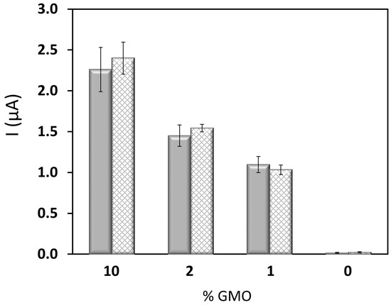 Variation of the chronoamperometric signal, in absolute value, recorded using the PCR-electrochemical genosensor method with GMO percentage. MON810 maize (solid grey), GTS40-3-2 (striped grey).