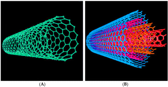 Schematics of an individual (A) SWCNT and (B) MWCNT. Cited from Reference [9] with permission.