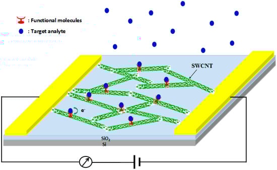 The CNT sensing mechanism has been extensively discussed by Fennell et al. [24]. Briefly, the absorption of analytes onto the CNT surface can change the conductance via the following factors (Figure 4): modulation of the Schottky barrier at electrode-CNT junctions, charge transfer between and CNT and the analytes, and increases in the CNT–CNT junction distance. For example, CNTs are p-type semiconductor under ambient conditions. The electrons donated into the valence band of CNTs by absorption of analytes will result in a decrease of hole concentration, causing a decrease in conductance. Conversely, electrons withdrawn from p-type SWCNTs will lead to an increase of the hole concentration in the CNT, resulting in an increase in conductance. The conductance change can also result from reducing the CNT charge mobility by introducing scattering sites. If some analytes are absorbed on the CNT-metal interface, the conductance might change by modifying the Schottky barrier. Because individual CNTs are not long enough to form conducting channels, the conducting channels are generally formed via connection by many CNTs. If the analytes are absorbed on the intertube junction, the conductance of CNTs can also be changed by disturbing the intertube junctions.