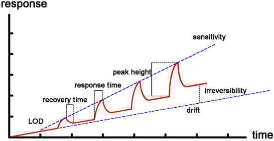 A sensor is a device that can respond to an external stimulus and give a recognizable signal. The external stimulus will change the conductance, capacitance, mass or other properties of the sensing material which are easy to be measured. A sensor’s performance is characterized by a different kind of parameters (Figure 3) [24]. These main parameters include: sensitivity, selectivity, stability, drift, response time, reversibility and so on. The sensitivity is closely related with the detection limit, which is the minimum value of an analyte that can be measured by the sensor. The lower the detection limit, the higher the sensitivity. The selectivity shows the sensor’s capability to distinguish the target analytes among a number of interferents. Many sensors require functionalization with recognition elements to increase the selectivity. Stability means the sensor’s capability to give the same response signal for an identical stimulus over time. A good sensor should remain stable over the lifespan of the sensor. Drift occurs when the response of a sensor changes even if the surroundings are fixed. It can lead to false or uncertain response signals. Response time is the time the sensor needs to increase up to the 90% of its final stable output after introducing the analyte. Comparably, recovery time is the time the sensor takes to decline to the 10% of its baseline after the analytes are removed. Other parameters such as hysteresis, deadtime, risetime and dynamic range have also been used to characterize the sensor performance, which have been full discussed in [23] by Fennel et al.