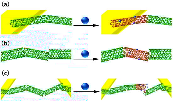 CNTs present excellent properties when used as sensing materials. However, pristine CNTs always show weak responses and low selectivity toward specific gas molecules due to the weak interaction between CNTs and analyte molecules, so there is a need to functionalize CNTs to improve both the sensitivity and the selectivity of SWNT sensors [10,11,12,13,14,15,16,17,18,19,20,21,22,23]. Noncovalent functionalization and covalent functionalization are the two primary methods to functionalize the surface of CNTs [24,25,26,27]. The non-covalent functionalization is based on supramolecular complexation via wrapping and adsorptive forces (e.g., π-stacking interactions and Van der Waals forces). Covalent functionalization covalently links the small organic molecules, polymers or metal nanoparticles on the surface of CNTs. These functionalized CNT sensors always exhibit high sensitivity and high selectivity toward target analytes.