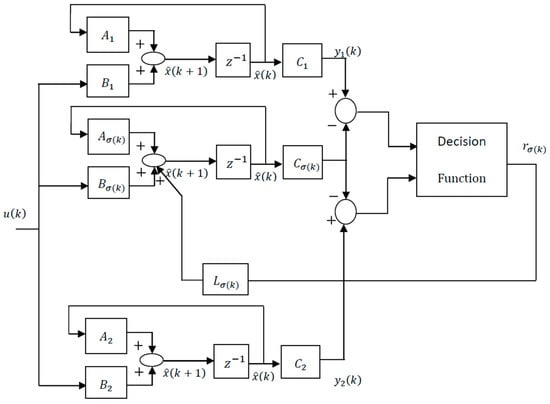where, is chosen a priori, is the measurement vector of the mode and is the related observer gain. The multi-measurement mode estimation-based switching observer scheme is depicted in Figure 1.