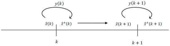 The classic Luenberger observer in Equation (2) estimates the state vector at time by using the available measurements at time. In this section we aim to discuss an approach to compute the estimate state vector at time by using the available measurement vector at time just like a standard Kalman filter. We denote as the state estimates at time incorporating the output at time as shown in Figure 2. Such an approach is based on the projection method and takes into consideration the last measurement to enhance the estimation performance (for further information about such an approach the reader is referred to []). More specifically, this estimation technique can be characterized as follows [,]: