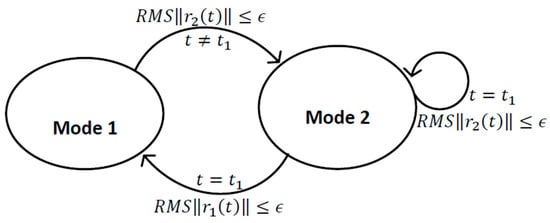 An essential question is the assessment of the residuals, i.e., how to decide a choice on the working operating mode utilizing the residuals. As the error dynamics are supposed to be stable, a possible assessment technique comprises choosing the mode that relates to the most reduced value of the residuals. For each system mode, we calculate the residual of the measurement with the output of the corresponding mode. The residual is then used to decide the operating mode; such a decision relies on the criterion used to discriminate among the different residuals, the resulting design scheme comes out to behave like a switching system. A general debate on switching system frameworks is beyond the scope of this article, and for an introduction readers can consult []. It is worth mentioning here that we don’t depend on a probability depiction of stochastic variables and events in general, and then a traditional Bayesian way to deal with this issue is prevented. In this context, a feasible solution comes out to be that of choosing the model with the smallest matching residuals.