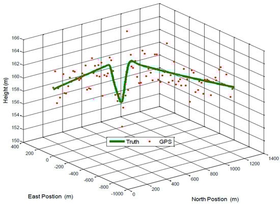 A trajectory of 100 s is used in the simulation of the aforementioned model. Figure 4 provides the 3D position trajectory for the true positions and GPS measurement.