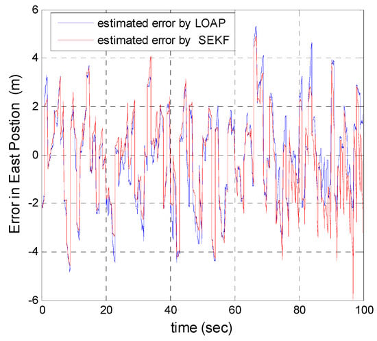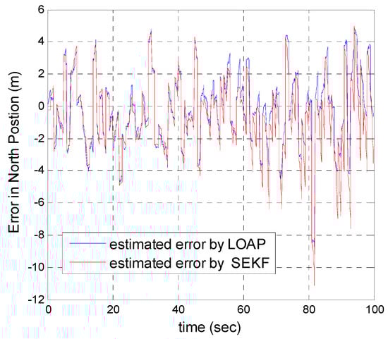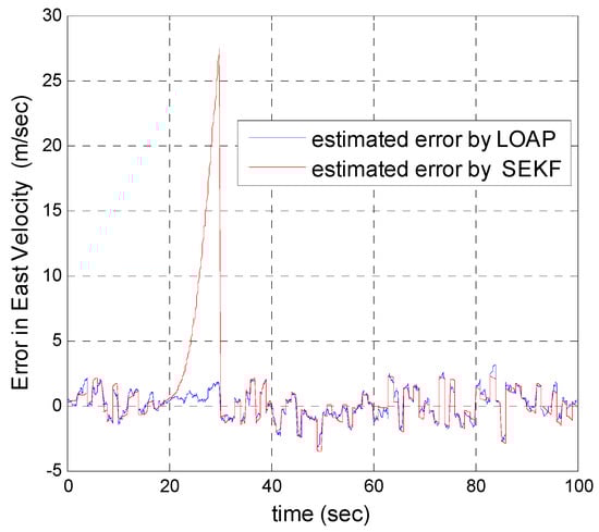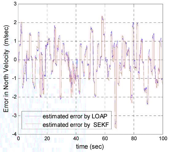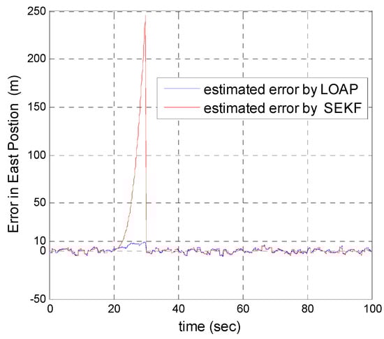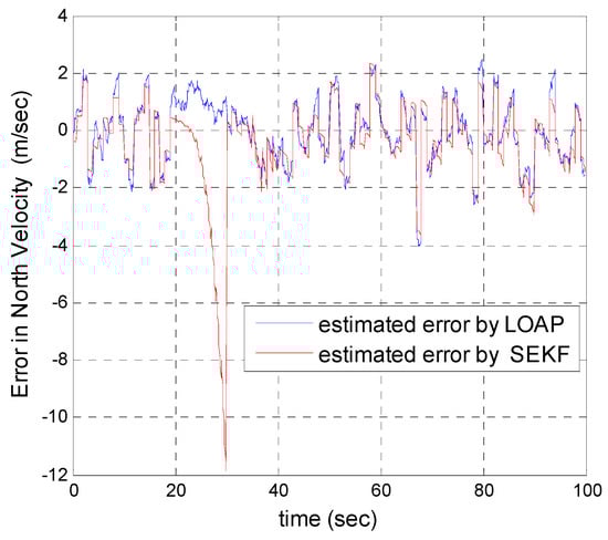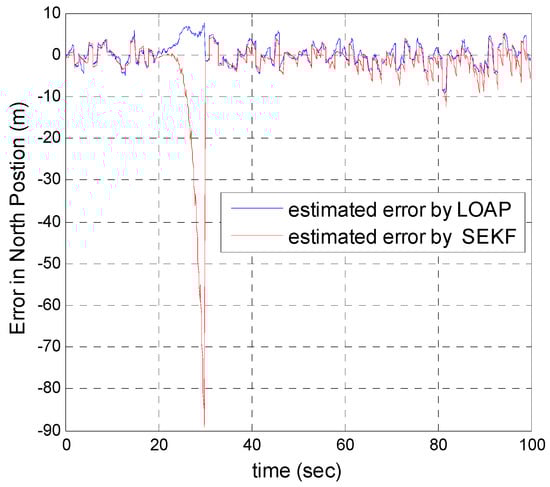 In our second simulation, we suppose that the GPS signal is disconnected and not available during the time from 20 s until 30 s. All the previous aforementioned simulation modeling conditions are the same for both the multi-measurement mode-based LOAP and the single mode EKF, except in case of single mode EKF we decreased the measurement errors for position and velocity in the east and north directions during the interval time when the GPS is disconnected to place more trust in the other sensors in the absence of the GPS signals, while the measurement error of height and down velocity remain the same as in the previous simulation because we are using a barometric altimeter to provide the height. From the simulation results in Figure 11 and Figure 12 we notice that the estimation error of the north and east positions in the case of the single mode EKF grows exponentially and increases quickly, reaching 89.355 m and 245.4513 m, respectively, while in the case of the multi-measurement mode-based LOAP the estimated position error remains stable and bounded within the acceptable range, increasing slowly and reaching 7.8117 m and 9.715 m for the north and east, respectively. Also, it is obvious from Figure 13 and Figure 14 with respect to the estimation error of the north and east velocities in case of the single mode EKF, it grows exponentially, increasing quickly and reaching 11.88 m/s and 27.4918 m/s, respectively; while in the case of the multi-measurement mode the estimated velocity error remains stable within less than 1.7622 m/s for the north and reaching 1.8424 m/s for the east direction.