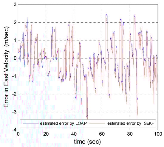 A trajectory of 100 s is used in the simulation. We use the same measurement sources for both multi-measurement mode estimation-based LOAP and single mode EKF and suppose the GPS signal is available every 1 Hz for both of them. For the latter estimator, when the GPS signal is available we assign the sampled measurement uncertainty matrix where the GPS has a measurement error with deviations equal to 2 m in position and 1 m/s in velocity, while the former does not require a priori statistical information about the measurement error, but the randomness of the sensor errors has been considered in the simulation. As the sensor error is random and every sensor has its own measuring error, the simulation has done based on extensive Monte Carlo runs. Also, for EKF at every 10 Hz when the GPS is unavailable and since the measurement depends on the other sensors we increase the values of the measurement errors in position and velocity by multiplying by the same deviations when the GPS is available by scale factor 10 and that is because the measurement position and velocity from the GPS is more accurate than the measurement position and velocity from the IMU-based MEMS but this increases the measurement noise just applied on the position and velocity in the east and north directions without the height and down velocity because of the use of a barometric altimeter to measure the height in case the GPS is unavailable with measurement noise deviation equal to 1 m. It is obvious from the Figure 5, Figure 6, Figure 7, Figure 8, Figure 9 and Figure 10 that when the GPS signal is available without any disconnection every 1 s during the time of flight then the proposed multi-measurement mode-based LOAP and the single mode EKF almost perform equally, with slightly differences between both of them where the deviations of the estimated position errors in Figure 5, Figure 6 and Figure 9 and the deviations of the estimated velocity errors in Figure 7, Figure 8 and Figure 10 are as summarized in Table 3.