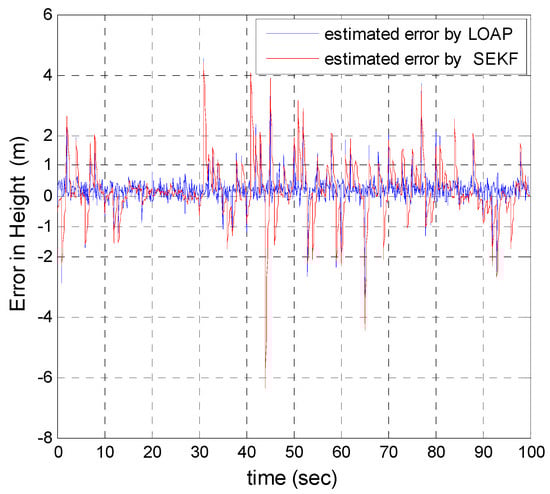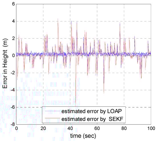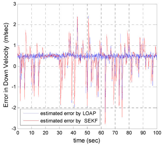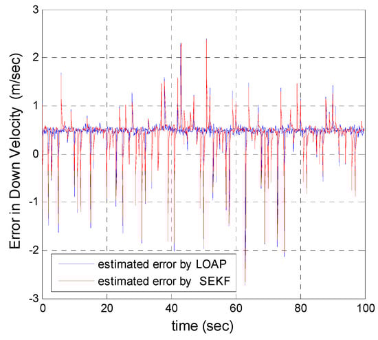 As a result, the superiority in the case of multi-measurement mode-based LOAP over the single mode EKF is obvious because when the GPS is not available at the instant of time which all the measurements should be available, the switching observer-based LOAP makes the right decision to switch to the second mode to guarantee the availability of the position and velocity measurements and then the stability of the estimation errors is obtained by solving the Lyapunov inequality-based stability by means of the LMI approach and this keeps the dynamic estimation error bounded by selecting the observer gain matrix (). However, as shown in Figure 15, the estimation accuracies in the vertical channel have been improved in the absence of GPS because of the height measurement acquired every 10 Hz from a barometric altimeter with higher accuracy than GPS in the vertical channel while the down velocity gathered on the basis of the fusion between altitude measurements from a barometric altimeter and an available vertical acceleration from a vertical accelerometer measurements every 10 Hz, and consequently the results of the estimation error in height and down velocity for the case of the multi- measurement mode-based LOAP and single mode EKF are almost the same with a slight difference between both of them being almost within less than 0.8 m in height and 0.7 m/s in down velocity as shown in Figure 16. These results clearly validate the advantages of the multi-measurement mode-based LOAP approach over the single mode EKF, especially when the observations from the GPS are not available during an interval of time. Consequently, the proposed technique guarantees the availability of the measurement data from various sensors in the absence of the information from the GPS receiver to keep describing the dynamics of the system.