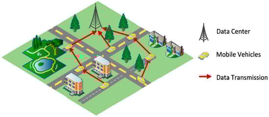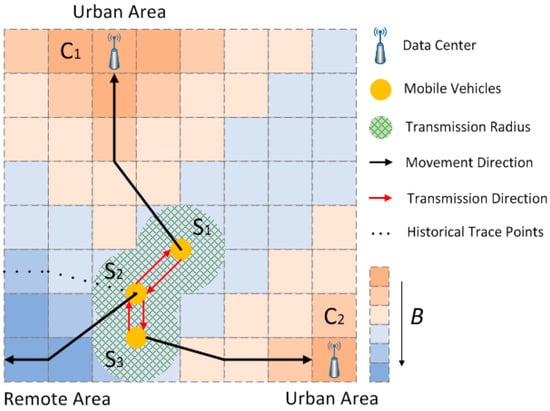 After correctly measuring the importance of different data packets, an effective scheme for transmission between mobile vehicles is needed to make sure that important packets can be transmitted to data centers as soon as possible. The typical problem depicted in Figure 1 is described as follows: