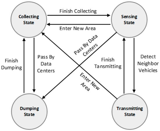 Before formally presenting the design details of the LCODC scheme, an explanation of the running states of mobile vehicles is provided to facilitate further discussions. In the LCODC scheme, the running states of mobile vehicles can be divided into four different kinds: (1) collection state; (2) sensing state; (3) dumping state; (4) transmitting state. Switching between these states enables the collected data to be exchanged between mobile vehicles or transmitted to data centers, and finally achieves the goal of obtaining recent data about remote areas. Below are detailed explanations of the four different states: