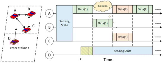 The process of sensing neighboring mobile vehicles and receiving data packets is called the sensing state. Specifically, periodic beacon messages are sent by mobile vehicles in the sensing state. As a result, every vehicle is able to detect neighboring vehicles according to these beacon messages. Apart from receiving beacon messages, mobile vehicles also receive data packets transmitted by neighboring vehicles when in this state.