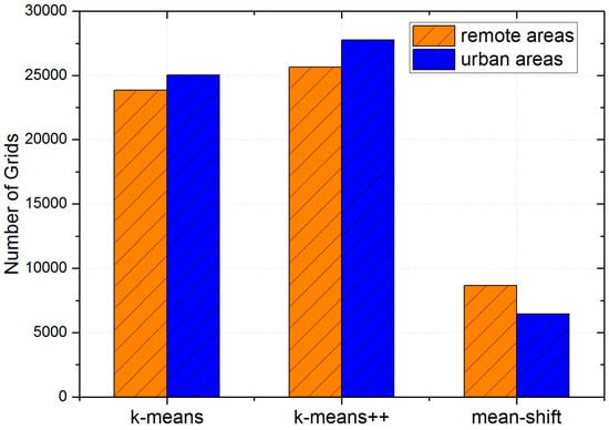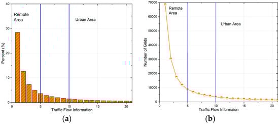 According to Figure 5, we define grids with traffic flow information smaller than 6 as remote areas, while grids with that greater than 10 are defined as urban areas. Therefore, we first find out the exact distribution of uploaded data packets. Figure 10 presents the detailed distribution of the average latency and Figure 11 presents the number of remote and urban areas (grids) covered by uploaded data packets. Besides, Figure 12 shows the distribution of remote and urban areas covered by data packets.