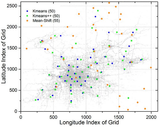 Real-world information on the trajectories of mobile vehicles is usually represented by a series of trace points in the map. Therefore, the first sub-scheme can be converted into a clustering problem that aims to find out the internal structure of trace points []. Clustering will divide these trace points into different classes, with a high similarity between points in the same class and a low similarity between points in different classes. In the first sub-scheme of the LCODC scheme, Euclidean distance is adopted to measure similarities while different classes are represented by data centers. In conclusion, the LCODC scheme converts the sub-scheme for deciding the location of data centers into a clustering problem.