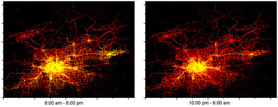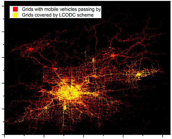 In this part, we separately pick out two sub-datasets according to the collection time of historical trajectories in the T-Drive dataset (10:00 p.m.–6:00 a.m. and 8:00 a.m.–8:00 p.m.) to study the performance of the LCODC scheme at different times in one day. Table 5 shows the experimental results based on these two sub-datasets. Intuitively, due to a decrease on the number of active mobile vehicles, the average latency and coverage of the LCODC scheme from 8:00 a.m. to 8:00 p.m. simultaneously outperform those from 10:00 p.m. to 6:00 a.m. Besides, a great difference exists between the number of uploaded data packets at different times in a day. Figure 18 presents detailed distributions of covered grids at the two time intervals separately.