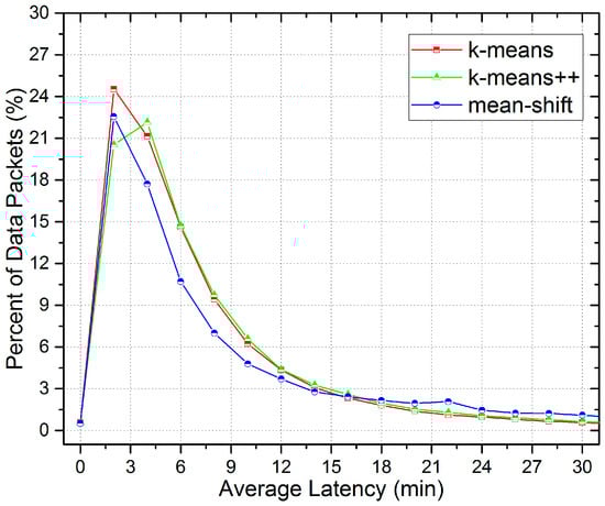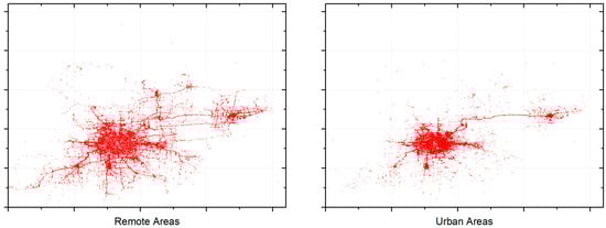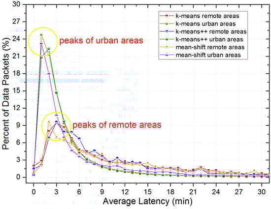 Intuitively, Figure 10 shows that data packets related to urban areas tend to arrive at data centers faster than data packets related to remote areas, as compared with peaks of remote areas, peaks of urban areas have a greater proportion (higher) and a smaller latency (ahead of). Figure 12 also shows that the distribution of remote areas has a sparser layout than that of urban areas. Besides, according to Figure 11, there is not a great difference between the number of remote areas and urban areas, which indicates that the LCODC scheme does optimize the data collection coverage.