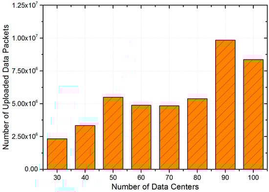 In the LCODC scheme, the number of data centers directly determines the hyper-parameter in k-means and k-means++. On the other hand, Figure 8 clearly demonstrates the correlation between the locations of data centers and the final performance of the LCODC scheme. Therefore, it is necessary to analyze the impact of the number and locations of data centers. Figure 13 presents changes of the total number of uploaded data packets while Figure 14 shows changes of average latency and coverage of the LCODC scheme with different number of data centers. Besides, Figure 15 presents the distribution on grids covered by uploaded data packets when the number of data centers is set to 100.