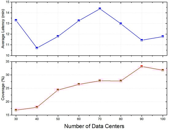 According to Figure 13 and Figure 14, the coverage still improves when the total number of uploaded data packets decreases (when the number of data centers ranges from 50 to 70), which cannot be clearly illustrated when taking the impacts of the number of data centers alone into consideration. Therefore, in the next part, we conduct an analysis on the locations of data centers. Besides, an increase on the number of data centers brings no improvement on the average latency according to Figure 14.