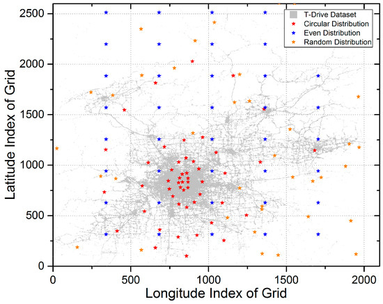 To begin with, we describe three different methods on deciding the locations of data centers for comparison with the LCODC scheme: (1) locations with random distribution, which indicates that we randomly pick out 50 different grids as the locations of data centers; (2) locations with even distribution, which indicates that data centers are evenly distributed, with 10 data centers along the longitude and five data centers along latitude; (3) locations with circular distribution, which indicates that data centers present a circular shape. Besides, we modify the location of the centers of circles to conform to the real layout of Beijing. Figure 16 presents detailed information on the layout of these data centers.