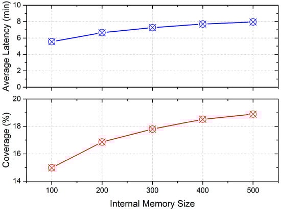 The internal memory size directly determines the number of data packets that can be stored by mobile vehicles. Therefore, the number of packets uploaded to data centers is expected to increase with the growth on internal memory size, leading to an improvement on the coverage of the LCODC scheme. However, with more data packets to be exchanged between mobile vehicles, the time consumption will also increase. Figure 17 presents the impact of internal memory size on average latency and coverage.